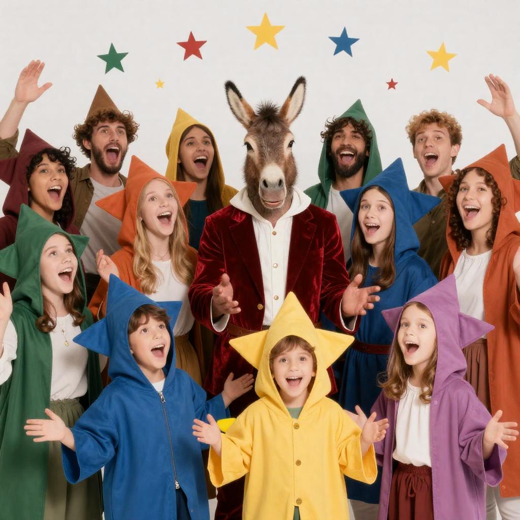 Photograph of a colorful, chaotic group of 12 people dressed as nativity characters, including a man in a red velvet suit with a donkey's head, surrounded by children in star costumes, hats, and colorful robes. Joyful, exaggerated expressions. Background is white with floating stars. People are crowded, reaching out, and smiling.