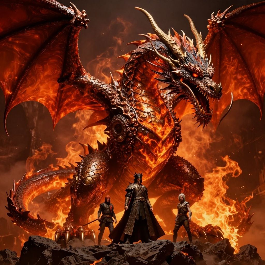 Digital artwork of three armored warriors facing a massive, fiery red and black dragon with wings spread, set against a blazing sky.