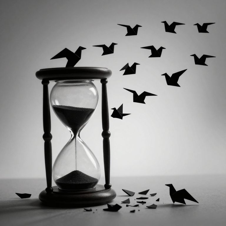 Black silhouettes of fifteen origami birds soar dynamically toward a large, vintage-style hourglass, its sand trickling downward as it rests precariously atop a scattering of broken fragments, symbolizing the relentless passage of time.