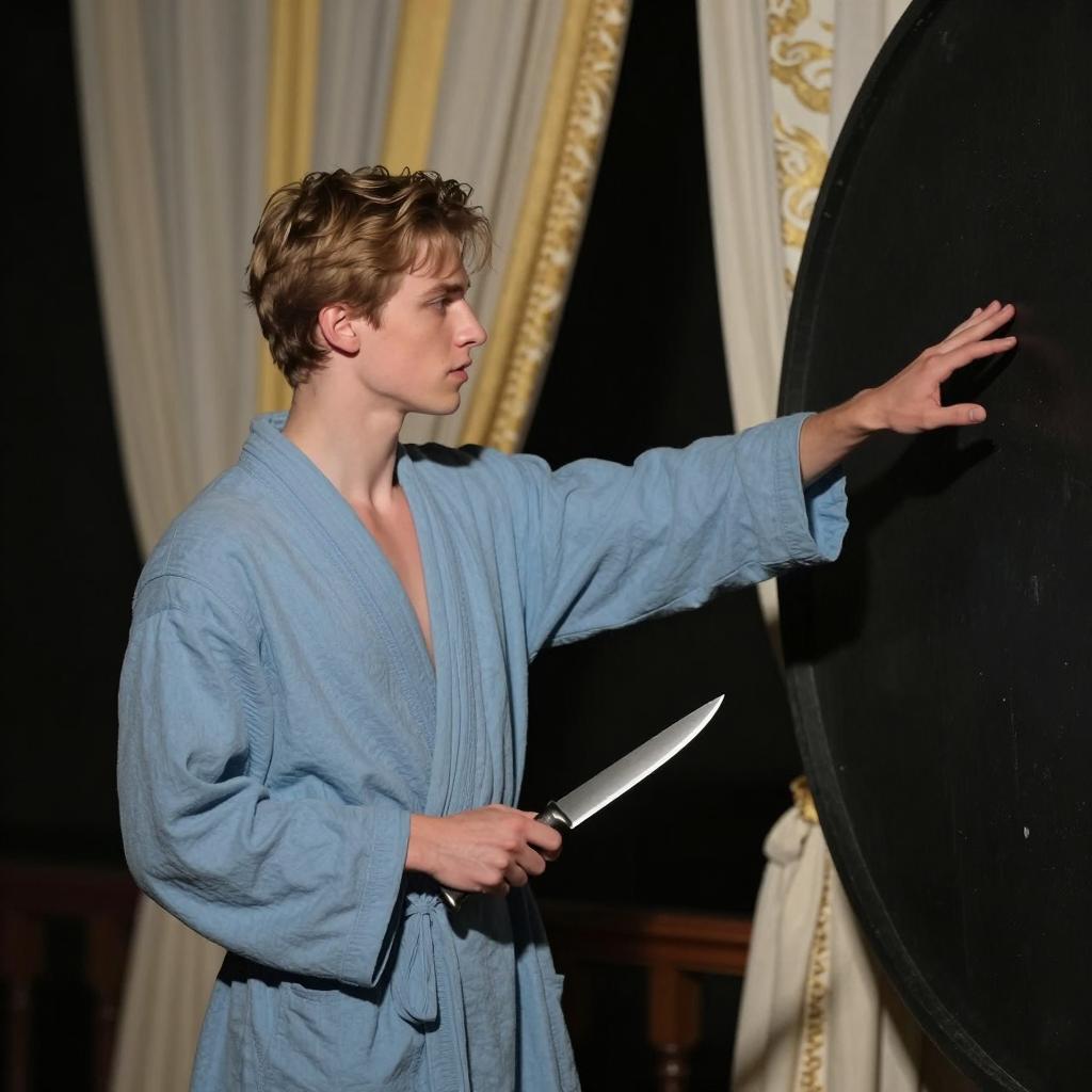 Photograph of a slender, young man with short, light brown hair wearing a loose, light blue robe. He holds a knife in his right hand and extends his left arm, reaching towards a large, black, circular object. Background includes draped curtains with yellow and white patterns. His expression is focused. The scene is dimly lit with shadows.