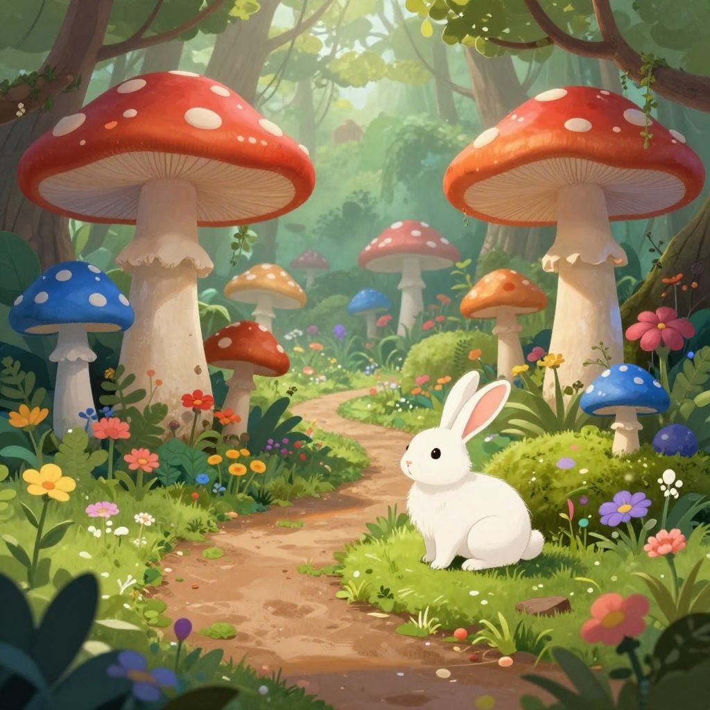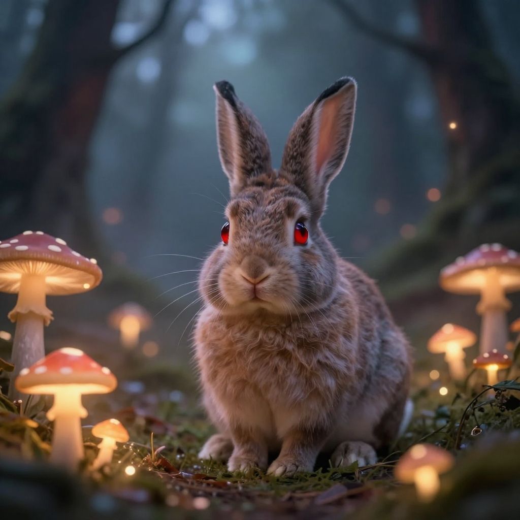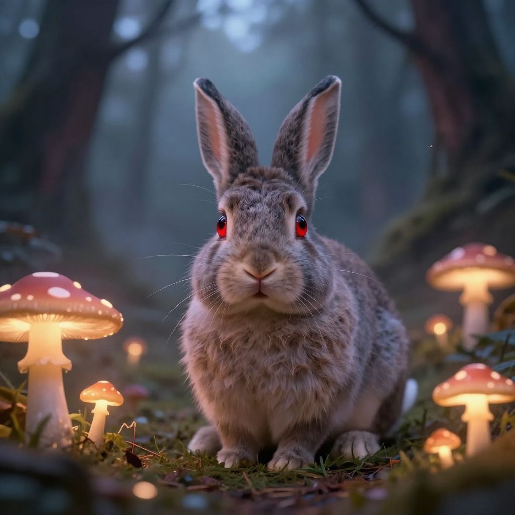 Bunnys with red eyes in a mystical forest at twilight, surrounded by glowing mushrooms and soft fog, detailed fur texture, ethereal lighting, fantasy art style