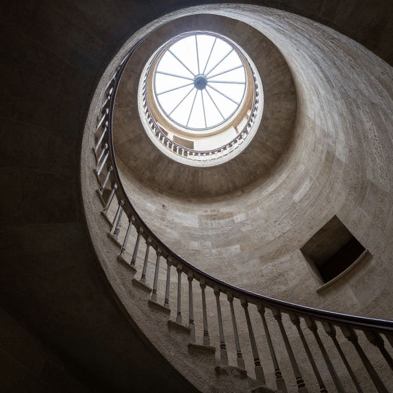In a labyrinthine embrace of serenity and mystery, the spiraling staircase ascends toward a luminous skylight, inviting contemplation amidst the quiet hum of timeless curiosity and the subtle scent of aged stone.