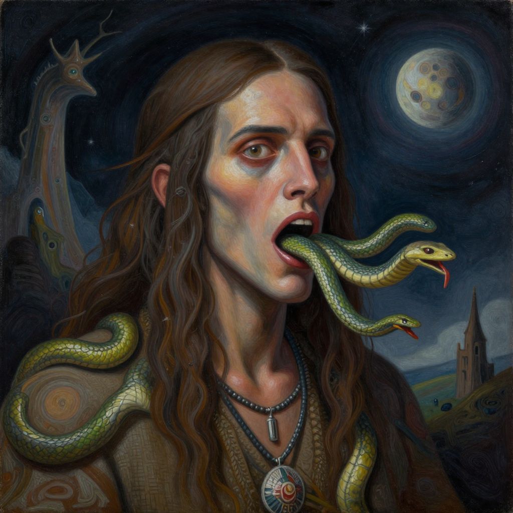 Digital painting of a pale, long-haired man with a snake in his mouth, moonlit night sky, fantasy creature in background, medieval castle.