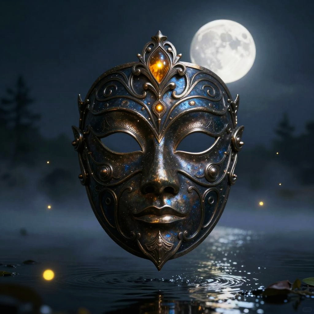 Fantasy mask art showcasing a mysterious enchanted mask with glowing eyes and elaborate metalwork, floating above a misty lake illuminated by moonlight and fireflies.
