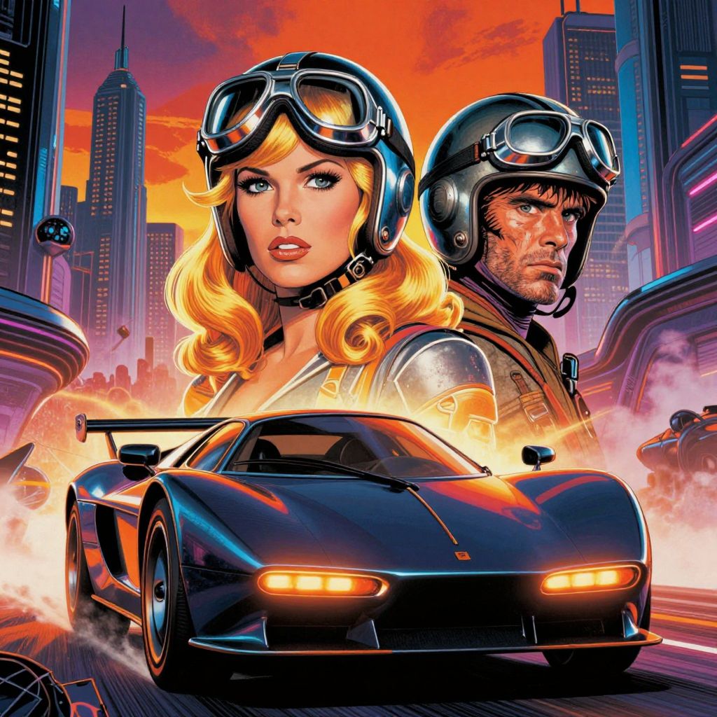 The image is a vibrant 70's comic book cover for a science fiction dystopia movie, bathed in synthwave colors. Dominating the foreground is a futuristic car, sleek and aerodynamic, with a dark body and glowing orange accents. Behind it, a woman with voluminous blonde hair and a determined expression wears a helmet with large goggles, her face illuminated by the intense neon hues. To her right, a man with a rugged, weathered look peers out from a similar helmet, his gaze fixed ahead. The background is a chaotic cityscape, with tall, futuristic buildings and a smoky atmosphere, hinting at a dystopian world. The sky is a mix of fiery oranges and cool blues, creating a stark contrast. The overall composition is dynamic, with the car and characters positioned centrally, drawing the viewer's eye through the scene. The interplay of colors and textures adds depth and intensity, capturing the essence of a high-stakes, sci-fi adventure.