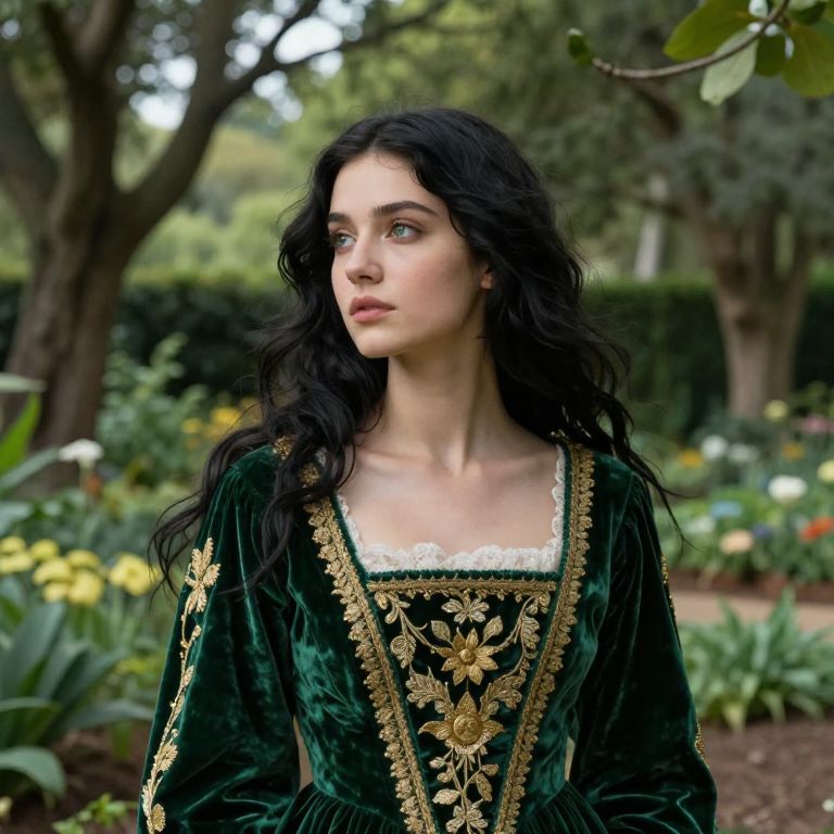 A captivating 28-year-old female artist stands amidst a lush garden, her wistful green eyes and flowing raven hair illuminated by soft, diffused light filtering through the canopy of trees. Her delicate features are highlighted in this highly detailed superrealistic portrait, rendered with Renaissance oil painting techniques. Wearing an emerald velvet dress intricately embroidered with golden thread and lace, she creates a contrast to the earthy tones of her surroundings, exuding an ethereal tranquility as she gazes thoughtfully into the distance.