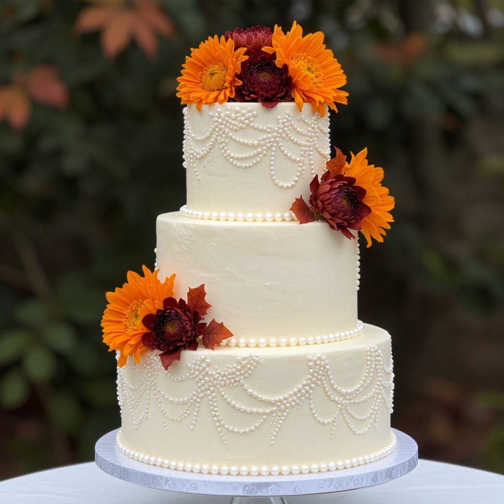 Elegant three-tiered wedding cake adorned with intricate pearl beadwork and vibrant orange and burgundy fall flowers, showcasing a classic yet festive design.