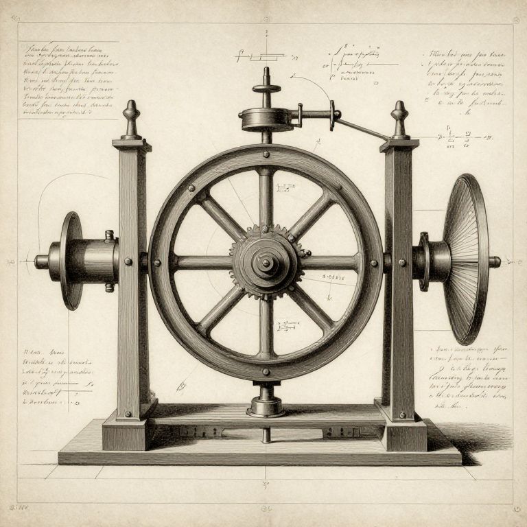 The image depicts a detailed 1800s blueprint of a perpetual motion engine, exuding an atmosphere of scientific inquiry and laboratory experimentation. The central object is a complex mechanical device with a large, intricately designed wheel at its core, flanked by two vertical cylinders and a series of interconnected gears and levers. The wheel, with its radial spokes and central hub, is the focal point, suggesting its pivotal role in the engine's operation. Surrounding the wheel are various mechanical components, including a fan-like structure on the right and a cylindrical component on the left, all meticulously drawn with precision. The background is filled with numerous annotations and calculations, written in a cursive script, indicating the meticulous planning and mathematical calculations involved in the design process. The overall composition is dense with information, with elements arranged in a hierarchical manner, guiding the viewer's eye from the central wheel to the surrounding components and annotations. The use of sepia tones and the aged appearance of the paper add to the historical ambiance, evoking a sense of the era's fascination with perpetual motion and the challenges of harnessing energy.