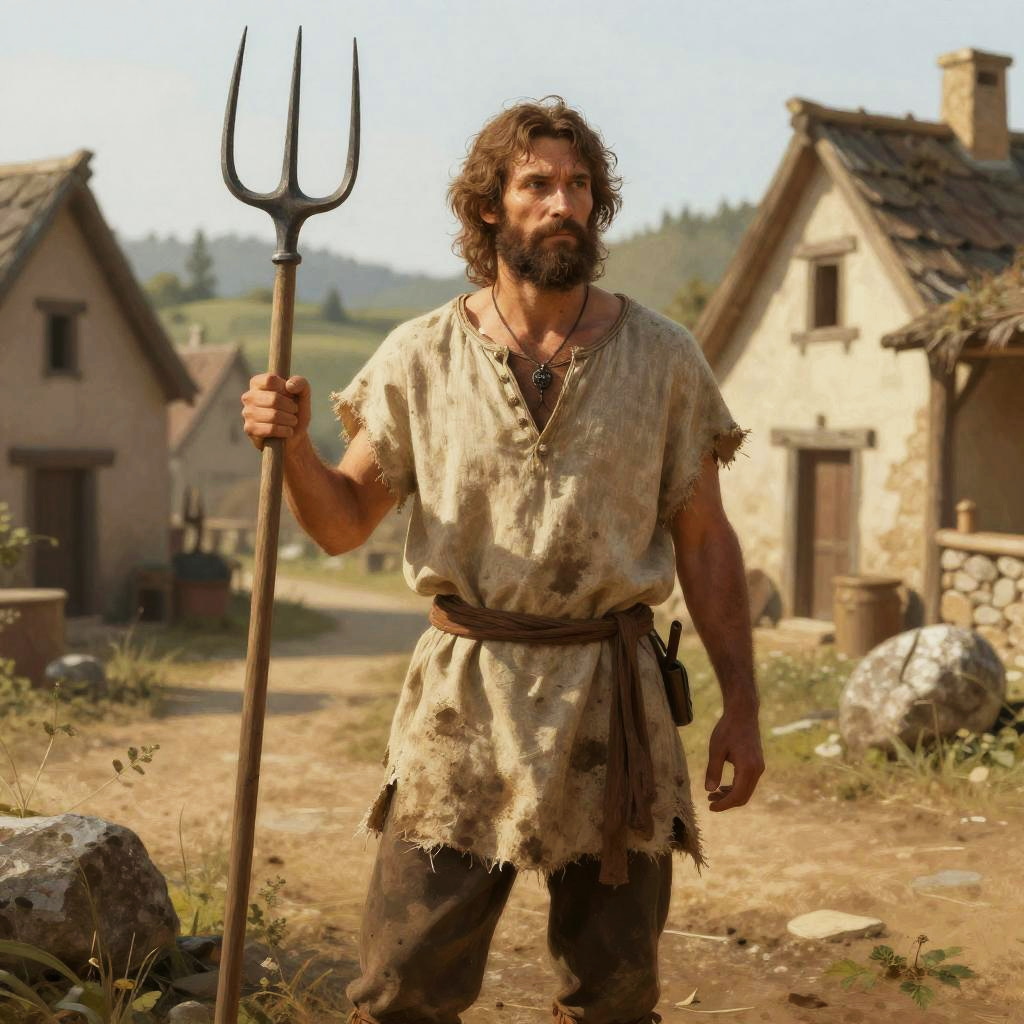 Peasant DnD character standing in a medieval village, wearing simple linen clothes with dirt stains, holding a wooden pitchfork, rustic houses in background, soft morning light, painterly style with earthy tones, detailed textures.