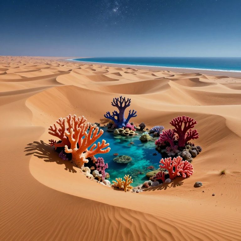 Craft an ethereal digital artwork reminiscent of Salvador Dali's dreamscapes, depicting a breathtaking aerial view of a vast desert landscape. In this surreal panorama, colossal, vivid coral reefs emerge dramatically from the towering sand dunes, captivating viewers with their juxtaposition against the barren terrain. Beneath these extraordinary underwater formations, a serene ocean mirrors the starlit sky above, blending tranquility and astonishment as one explores this mesmerizing dreamscape. The harmonious fusion of harsh desert surroundings and vibrant aquatic elements creates an emotional gradient that invites the observer to marvel at the contrasting beauty within this fantastical realm.