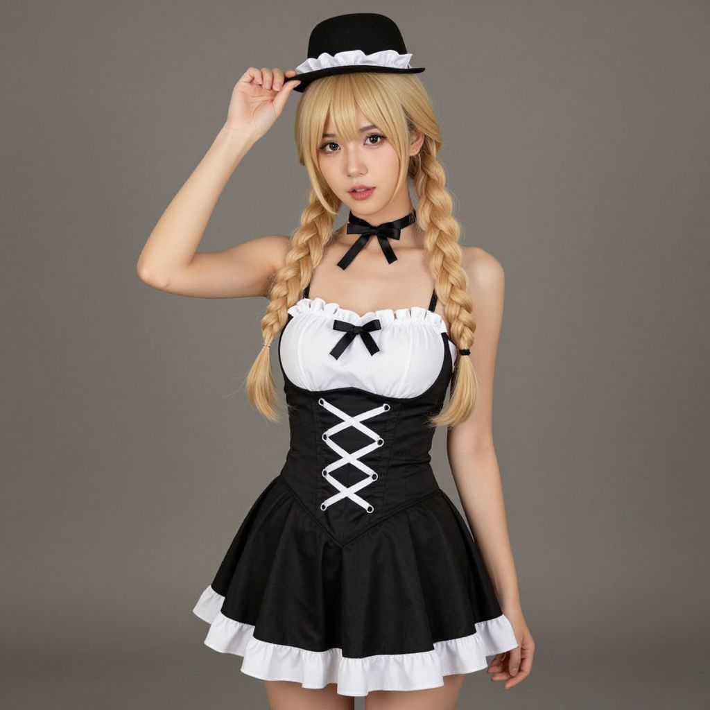 Digital anime-style image of a blonde woman with braids, wearing a black and white maid outfit, bow choker, and small black hat, against