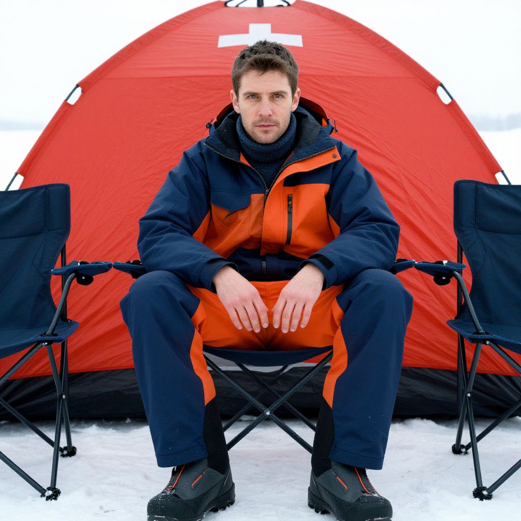 A man, lightweight waterproof jacket, breathable fleece mid-layer, insulated ski pants, durable snow boots, navy blue and bright orange, bright red tent, white cross emblem, surrounded by folding chairs, lithographic film style, focused expression, serene atmosphere. Man has masculine face and piercing eyes