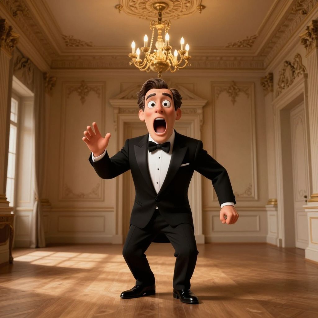 Trompe l'oeil style the image portrays a 3d rendered scene featuring a character that appears to be an animated, exaggerated version of a man. the character is dressed in a black tuxedo and bow tie, exuding an air of sophistication. his wide open mouth, large eyes, and expressive eyebrows suggest he is in the middle of an animated expression or gesture. the setting of the image is a grand room adorned with a chandelier hanging from the ceiling. the room's architecture is reminiscent of classic european designs, complete with detailed molding on the walls and doorways. the lighting casts shadows across the floor, highlighting the intricacies of the room's design. in terms of style, the image has a cartoon like quality, as evidenced by the exaggerated facial features and stylized clothing. however, the attention to detail in the background, such as the ornate ceiling fixture and wall moldings, suggests a high level of realism and craftsmanship in the rendering process. overall, the image captures a moment of lively animation within a richly detailed and visually stunning setting, showcasing the seamless blend of humor, drama, and intricate artistic design. . illusion of reality, hyper realistic, highly detailed