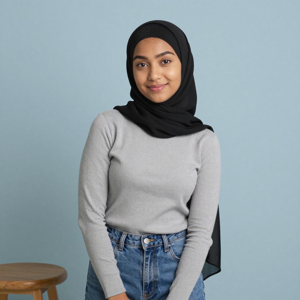 Photograph of a young woman with light brown skin and dark eyes, wearing a black hijab, gray long-sleeve top, and high-waisted pink jeans. She leans forward slightly, looking to the side with a subtle smile. The background features soft, pink and purple vertical stripes.