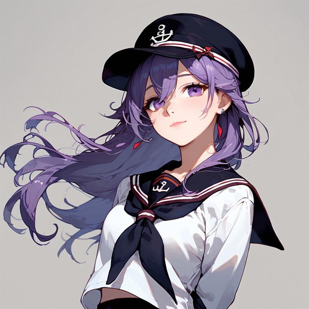 Score_9, score_8_up, score_7_up, score_6_up, score_5_up, score_4_up, , source_anime, 1girl, akatsuki \(kancolle\), purple hair, long hair, hair between eyes, purple eyes, flat cap, anchor symbol, black sailor collar, black skirt, loafers, long sleeves, neckerchief, pleated skirt, sailor collar, school uniform, serafuku, hands behind back, smile, upper body, looking at viewer, solo, simple background