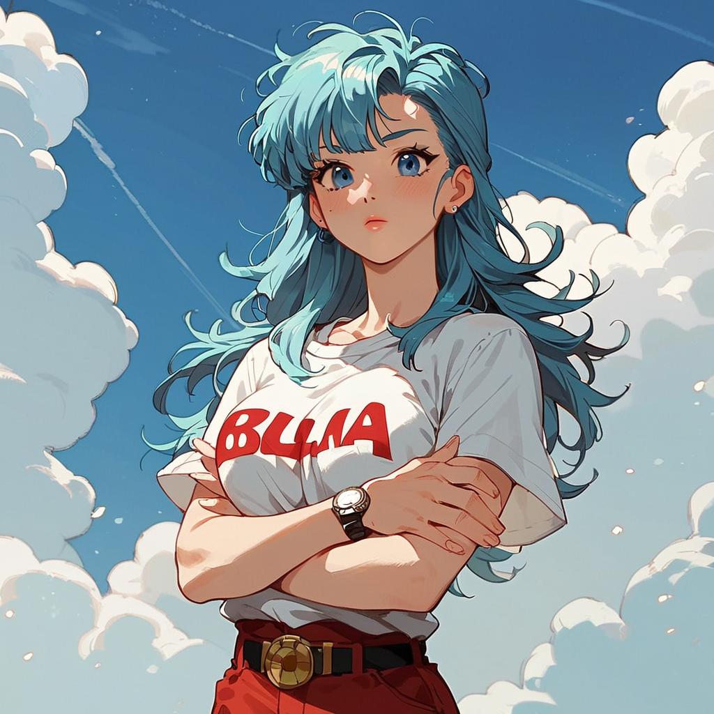 Source_anime, score_9, score_8_up, score_7_up, anime screencap, saiyan saga, bulma, messy hair, aqua hair, long hair, looking at viewer, blue eyes, 1girl, solo, jewelry, white shirt, short sleeves, stud earrings, sky, belt, red pants, cloud, clothing_grab, fingernails, crossed arms, t-shirt, clothes writing, watch, retro artstyle, wristwatch