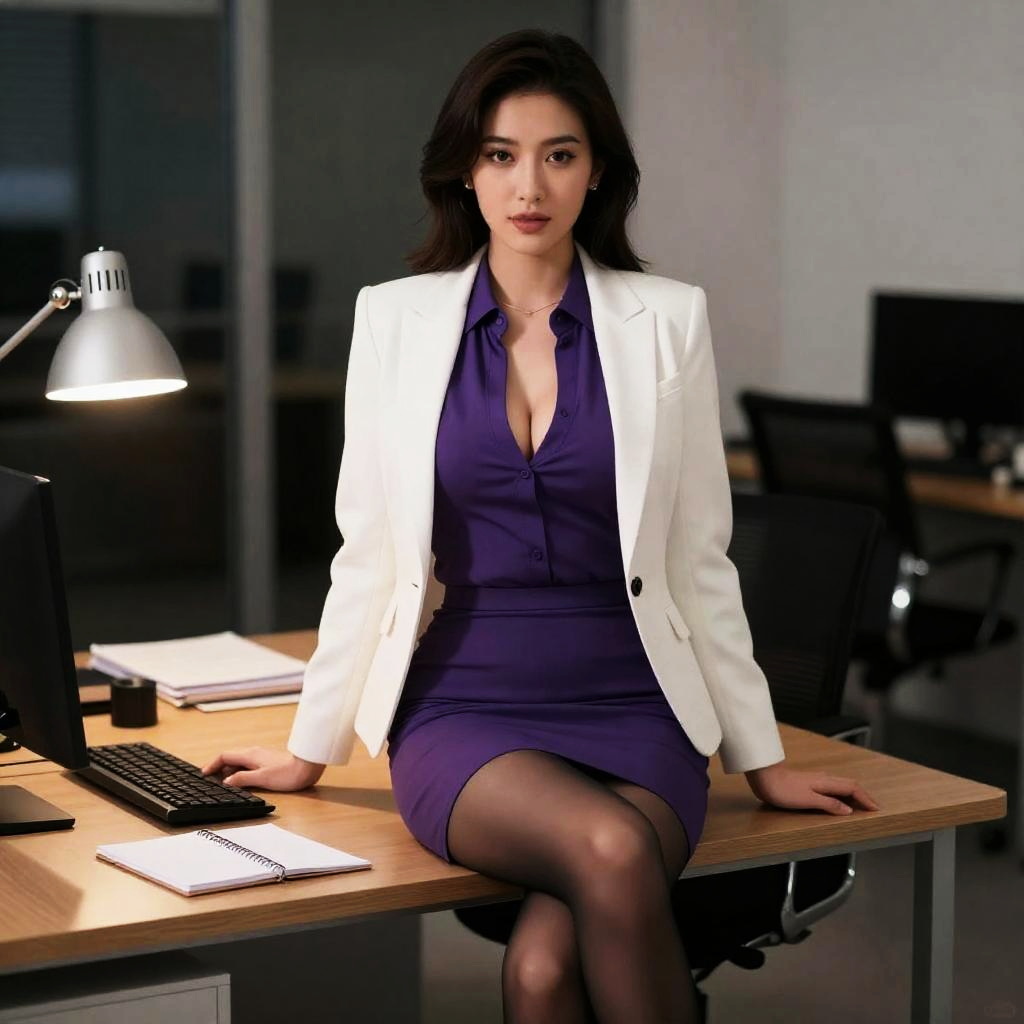 1girl, full body, looking at viewer, white jacket, purple shirt, pencil skirt, ((sitting on desk)), office lady, office, lamp, note book on desk, wariza, charming, milf, sexy, large breasts, pantyhose, (masterpiece), (detailed), (semi-realistic), detailed background, warm_light, night, indoors