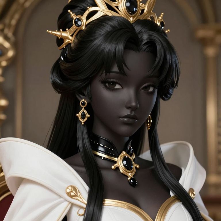 CGI image of a dark-skinned, black-haired woman with an ethereal, regal appearance. She has large, almond-shaped eyes, full lips, and wears a golden crown adorned with black gemstones. Her hair is styled in an elaborate updo with loose strands framing her face. She dons a white, high-collared gown with gold trim and matching golden earrings and choker with black gemstones. The background is blurred but suggests an ornate, classical setting with golden arches. Her expression is serene and slightly mysterious. The image has a realistic yet slightly fantastical style, emphasizing her royal and mystical qualities.