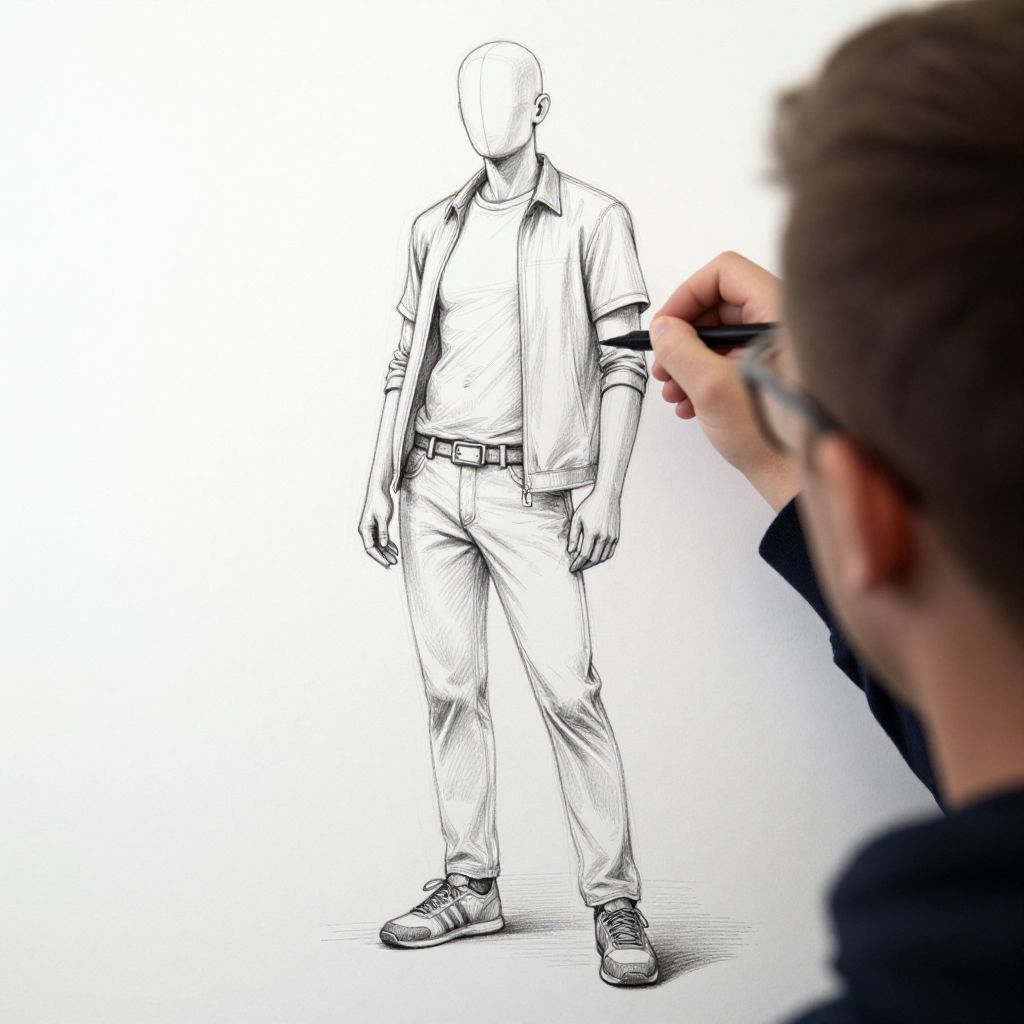 Man drawing full body with clothes, detailed sketch style, realistic anatomy, casual modern outfit, soft shading, white background, artistic pencil strokes