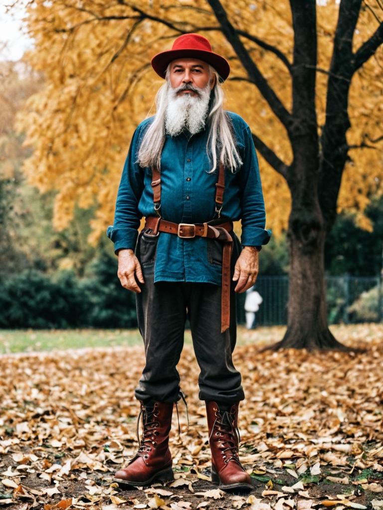 1boy, male focus, solo, beard, facial hair, hat, white hair, long beard, mustache, old man, standing, brown footwear, old, full body, belt, long sleeves, wizard, long hair, boots, looking at viewer, dwarf, red headwear