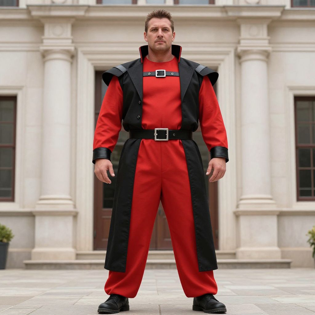 Extra Large Costume Male, man in a red and black outfit standing in front of a building