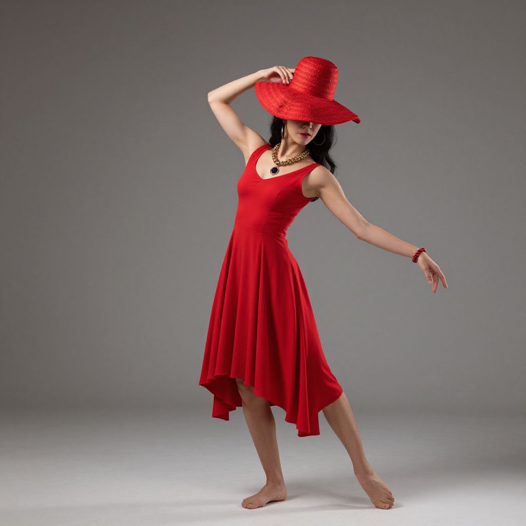 Dance costume, 1girl, solo, dress, hat, jewelry, realistic, red dress, necklace, parody, black hair, bracelet