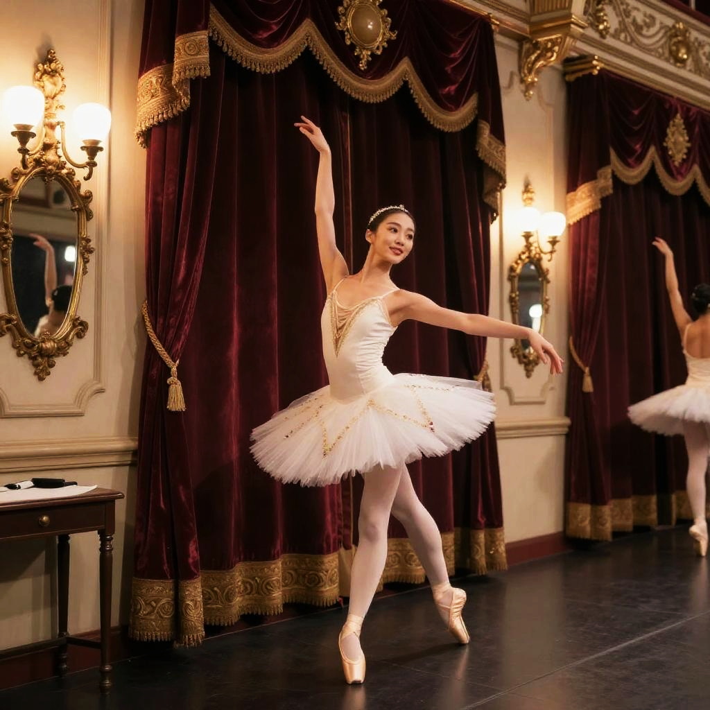 A ballet dancer confidently posing in a historic theater backstage, adorned with ornate velvet curtains and antique mirrors and soft lighting, creating a captivating atmosphere.