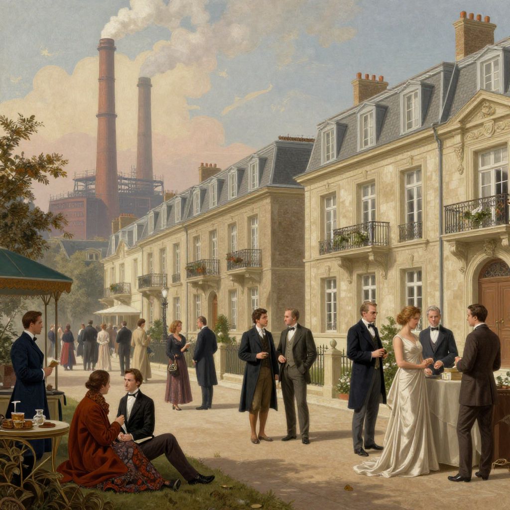 An artistic depiction of burgesia economic and social influence, blending images of factory smokestacks in the background with elegant urban apartments and well-dressed townsfolk engaged in business and leisure activities.