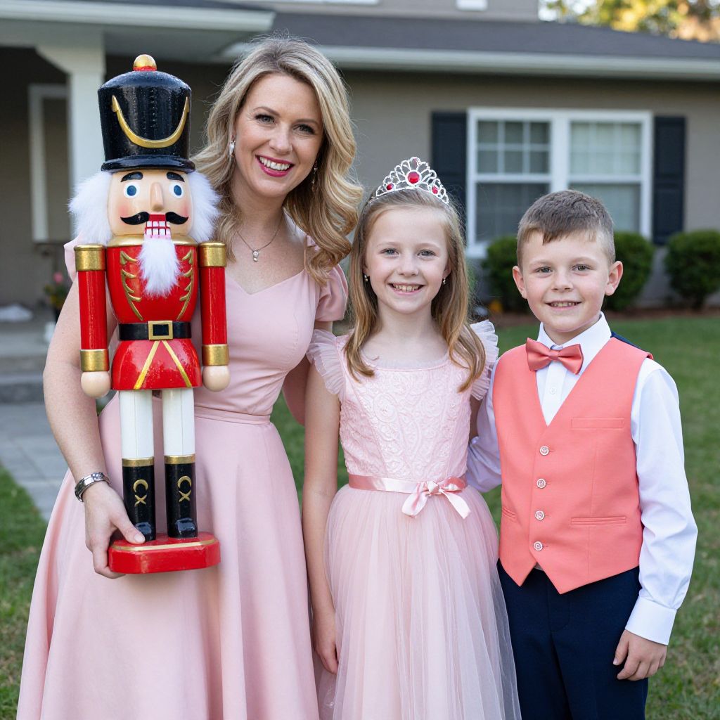 Family members gather outdoors for a festive Nutcracker-themed birthday party, with a woman in a pink dress holding a large Nutcracker figurine, a young girl in a tiara and tulle dress smiling brightly, and a boy in a coral vest and bow tie standing beside them, all set against a backdrop of a suburban home.