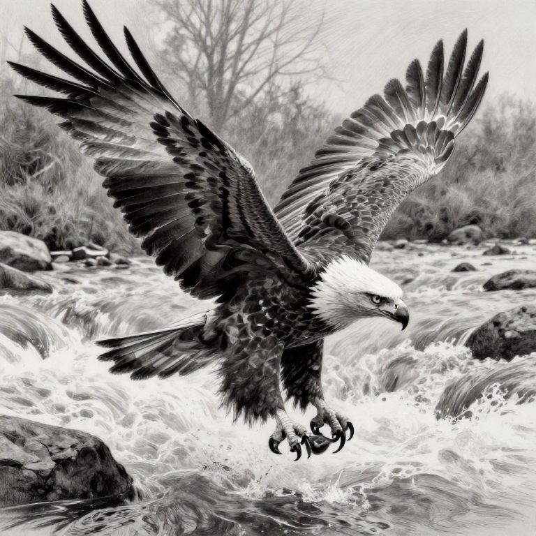 Realistic eagle drawing mid-flight over a rushing river, wings extended dynamically, talons open ready to grasp prey, feathers showing individual detailed strands, photorealistic graphite and charcoal illustration with dramatic highlights and shadows