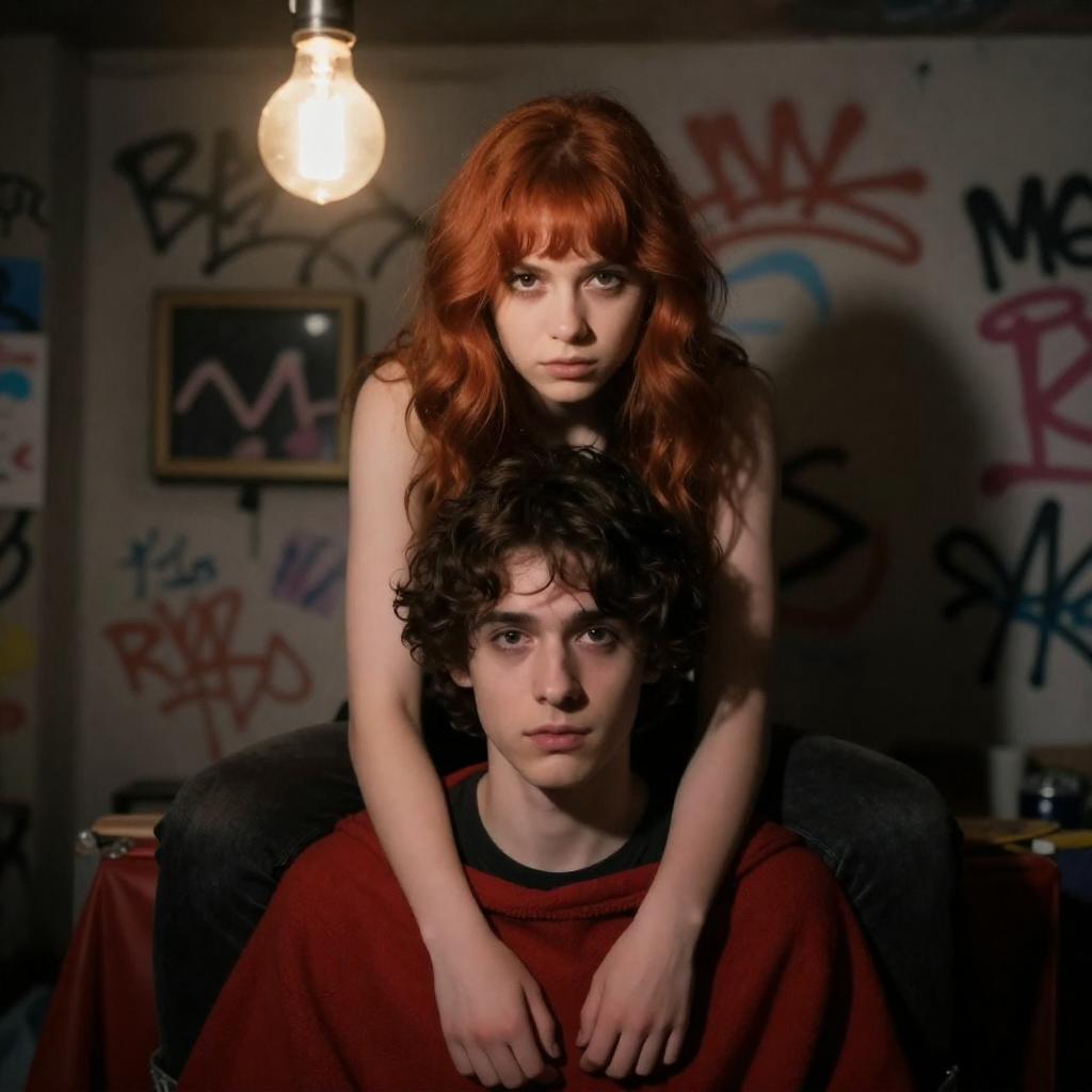 Blond man in black leather jacket holding white gun, intense expression. Red-haired woman with glasses in black clothing, nervous expression. Background with green grid pattern. Both seated closely. Man's left arm around woman's shoulder. Two people.