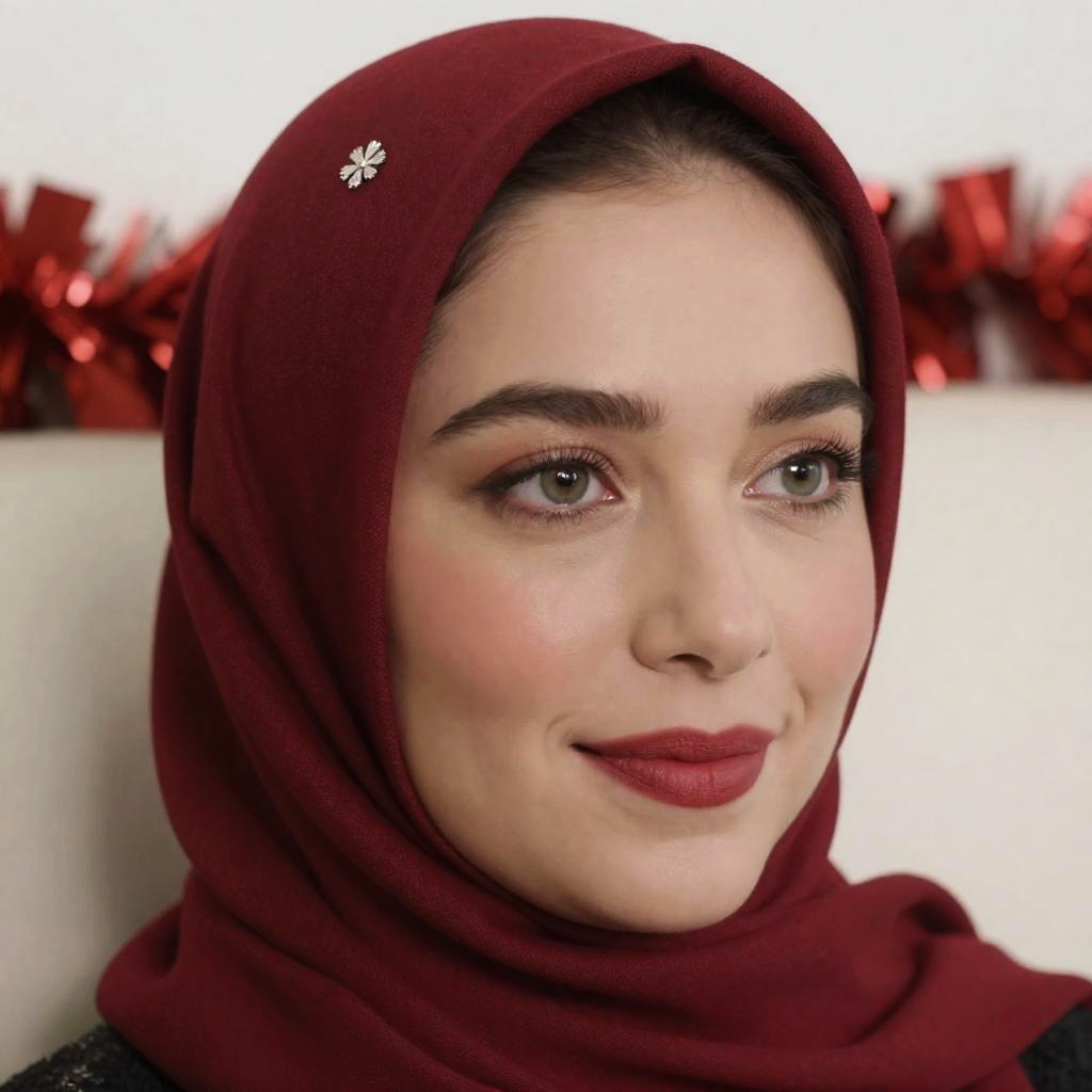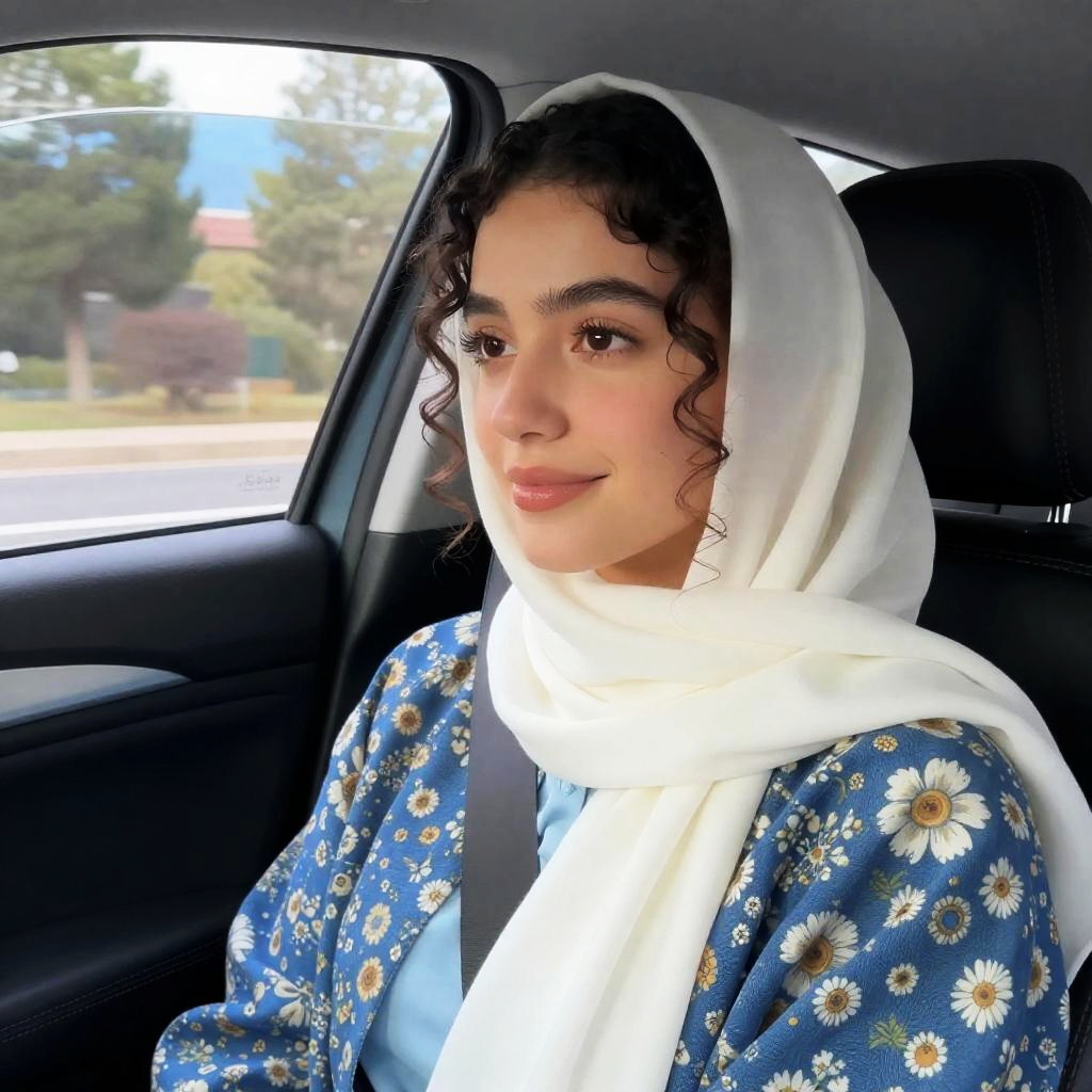 Photograph of a young woman with light skin and dark curly hair, wearing a white headscarf, blue floral jacket, and light blue shirt, sitting in a car. She smiles slightly, looking to the left. Trees and a blue sky visible through the car window.