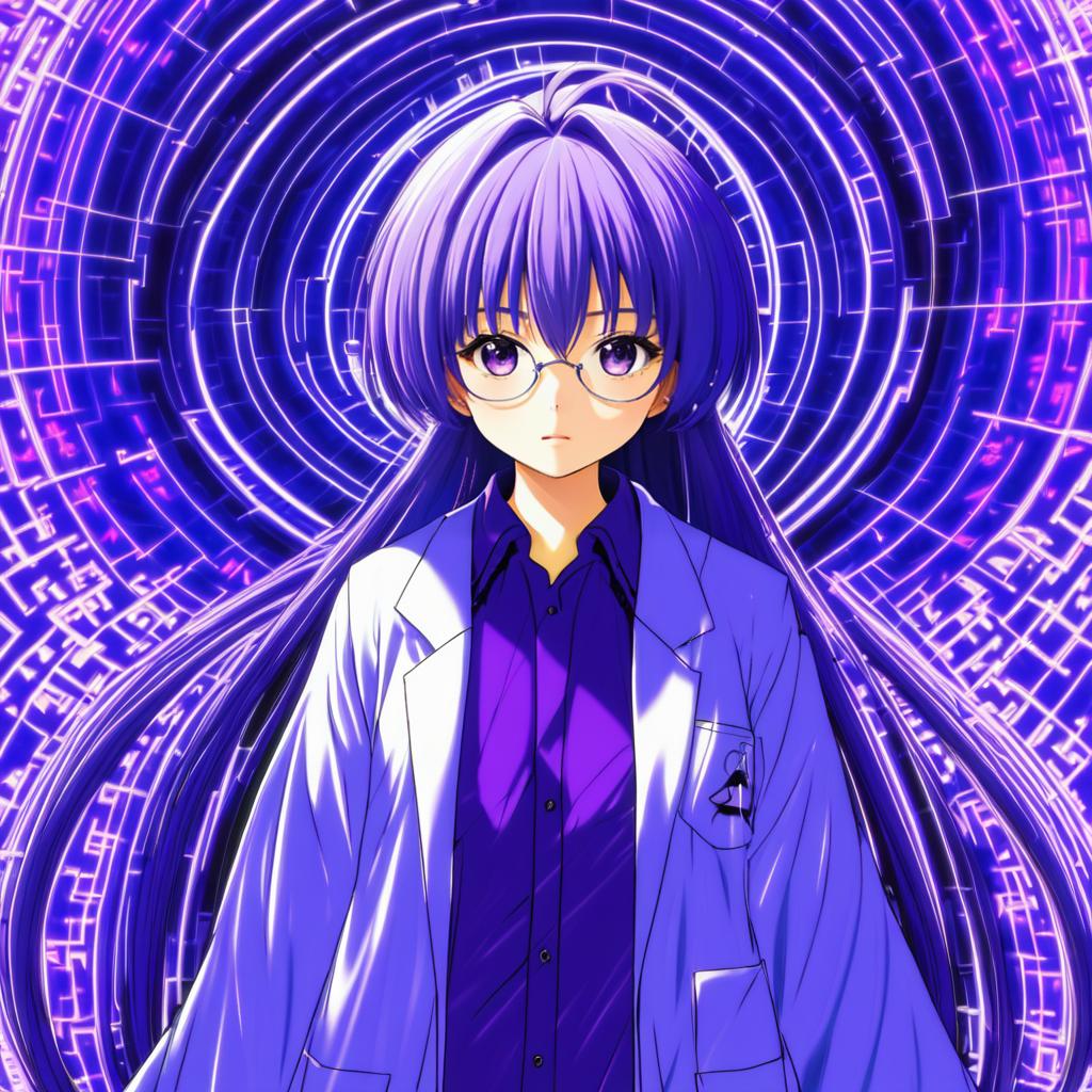 Asakura rikako, touhou, 1girl, purple eyes, glasses, purple hair, long hair, very long hair, hair ribbon, lab coat, long sleeves, by artist ponytail korosuke, anime