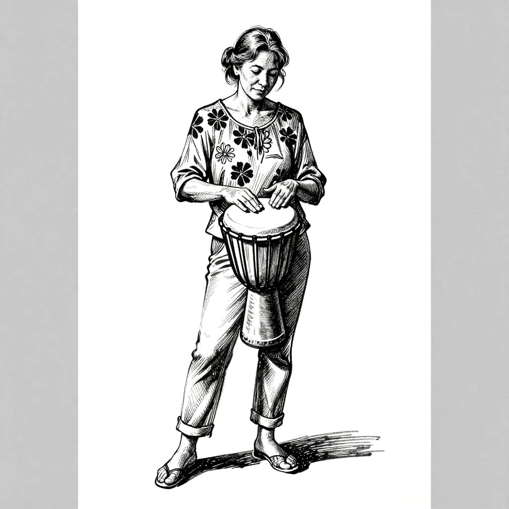 This is a woodcut style drawing study of a middle-aged woman in a floral blouse and jeans holding a djembe drum. One leg slightly forward, head tilted down, eyes on the strings. Quick gestural lines, confident hatching, smudged shading, casual and spontaneous. High contrast black and white on mostly white background with soft gray side borders and subtle paper texture. Clean composition, minimal props, slight figure tilt. Studio light from above, gentle falloff, elegant and restrained mood.