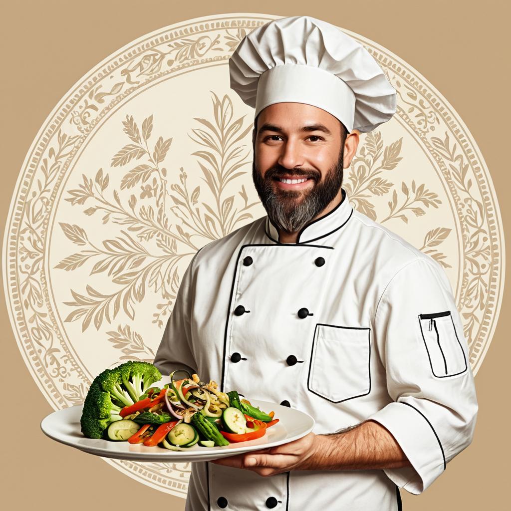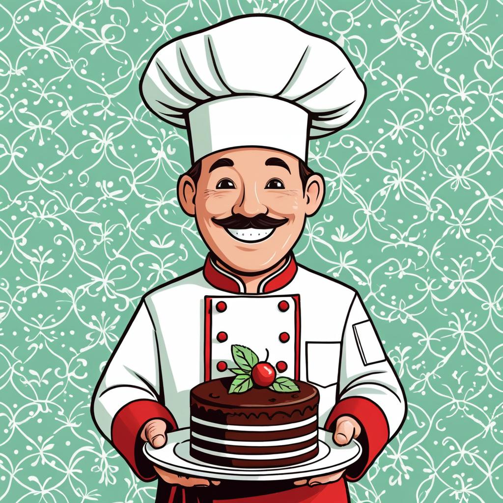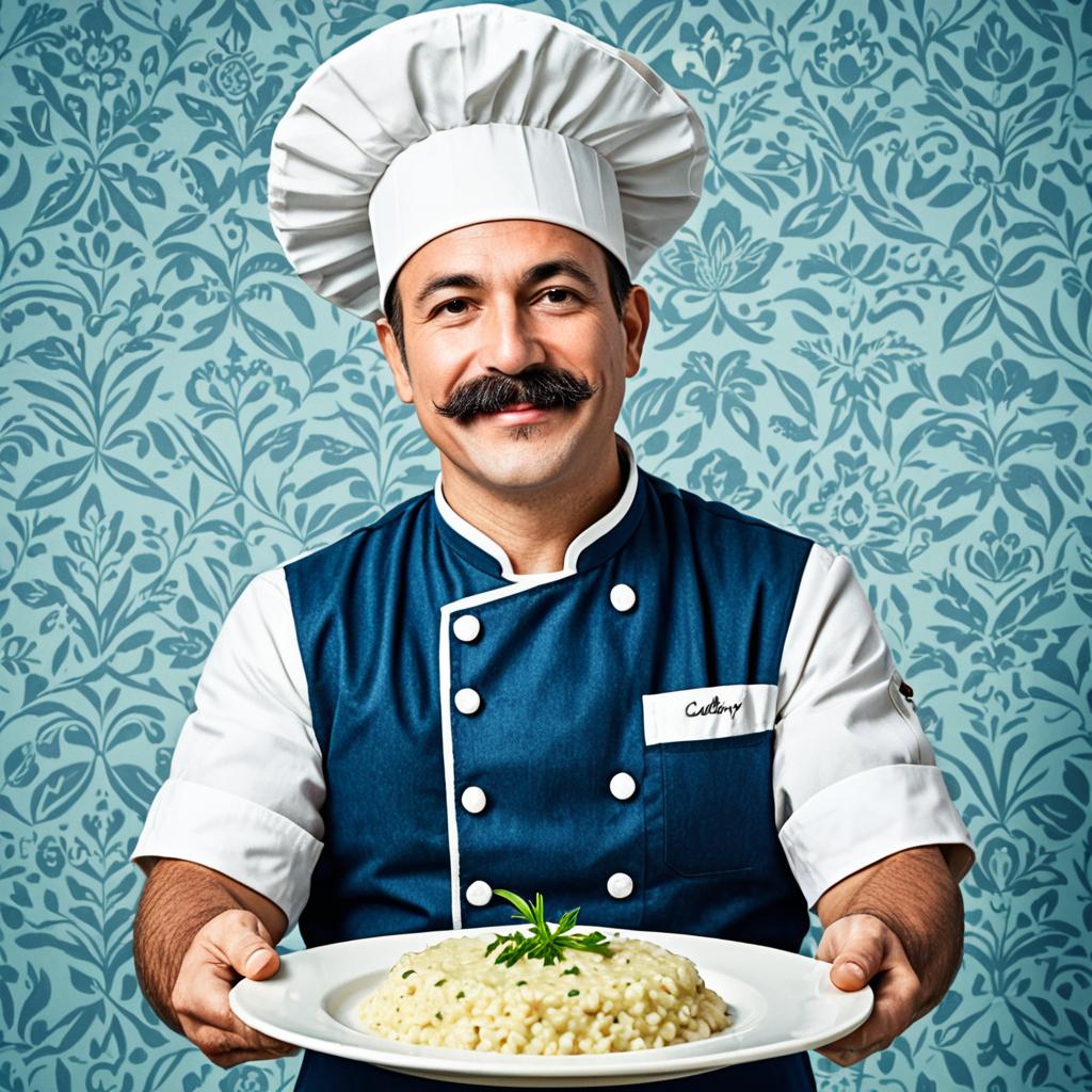 Cartoon illustration of a cheerful chef with a large mustache, wearing a traditional red chef's uniform and tall chef hat. The chef stands confidently, holding a plate with a freshly prepared pasta dish garnished with herbs. Background features a subtle decorative pattern in a soft beige, creating a friendly and inviting atmosphere.
