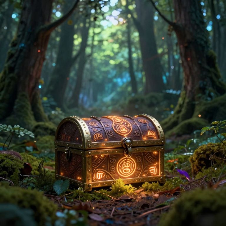 This digital artwork depicts a mystical forest scene with a glowing, ornately decorated treasure chest at the center. The chest, illuminated by intricate runes and symbols, emits a warm, orange glow. It is metallic with detailed patterns and a central lock. The forest background is lush and dark, with tall trees, moss-covered trunks, and scattered wildflowers. Light filters through the canopy, creating a magical, ethereal atmosphere with soft, blue-green hues in the background. The forest floor is rich with greenery and small plants. The image combines realistic textures with fantasy elements, creating a whimsical and enchanting visual.
