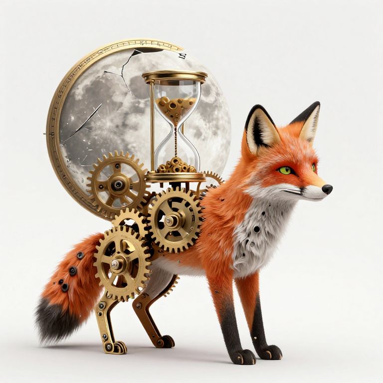 A clockwork fox winds its gears beneath a moon made entirely of shattered hourglasses, each tick echoing with the voices of forgotten time.