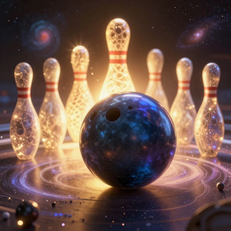 A cosmic 3D-rendered scene depicts a colossal bowling ball rolling through a miniature galaxy, surrounded by glowing nebulae and illuminated by dramatic golden-hour lighting, as its pins are crafted from shimmering, humming celestial formations.