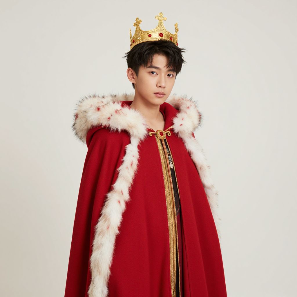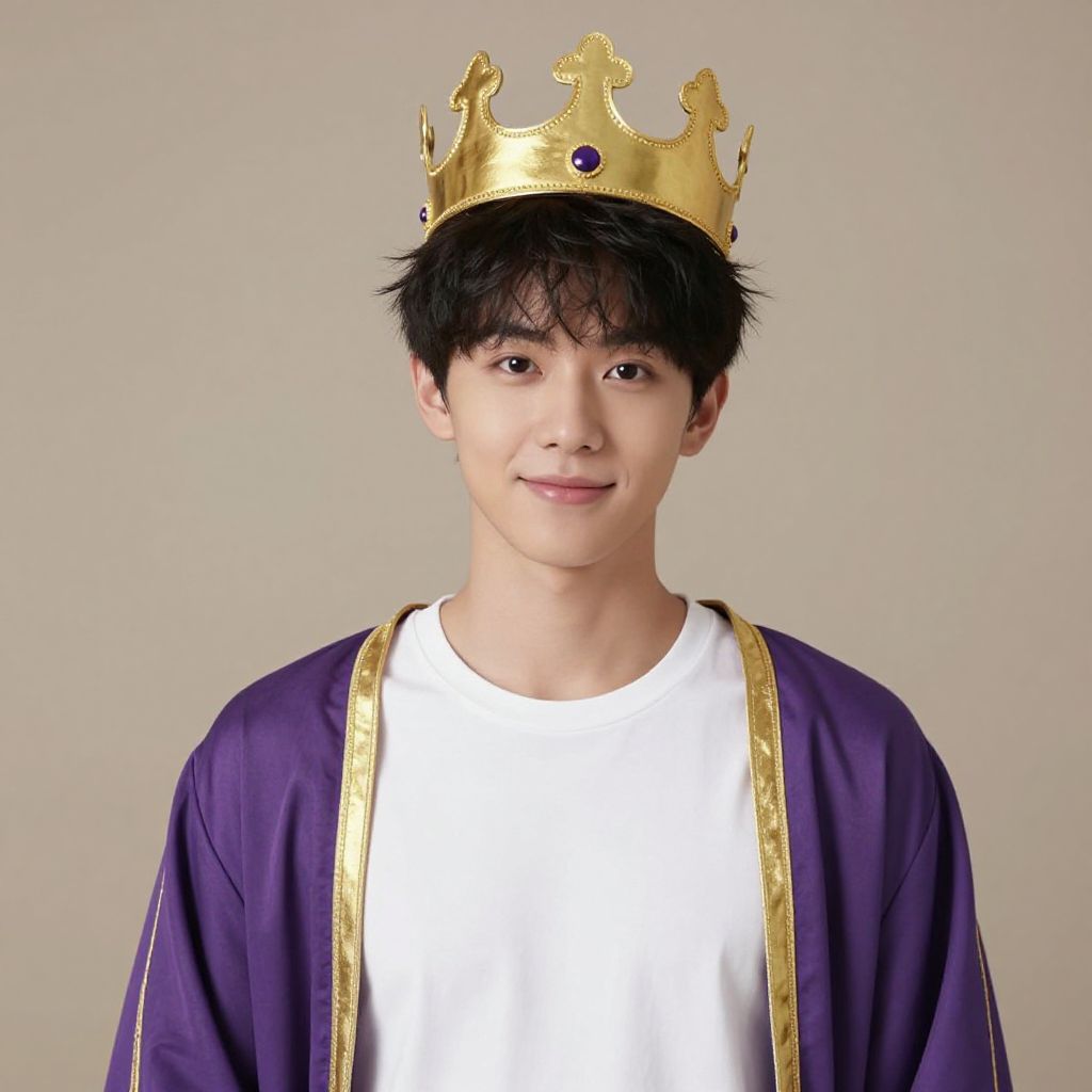 Photograph of a young man with blonde hair, wearing a gold crown and white ribbon choker, standing against a tree.