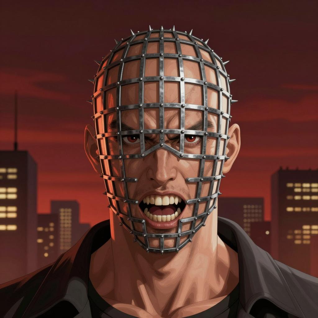 CGI illustration of a bald man with a metal grid covering his head, intense expression, open mouth showing teeth. Background: dark red sky, city skyline with lit buildings. Man wears dark clothing, muscular build. Metal grid has spikes protruding.