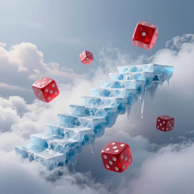 A surreal staircase of cascading ice steps ascends into the sky, defying gravity as it dissolves into mist, while red dice float whimsically, casting an otherworldly glow against the ethereal clouds.