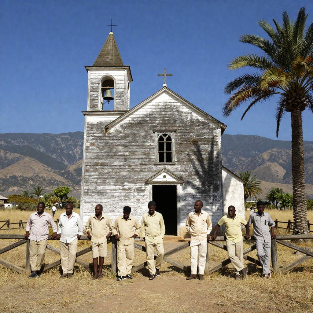 Nine men dressed in beige clothing standing and leaning on a wooden fence in front of an old, weathered wooden church with a bell tower. The scene is set in a dry grassy area with palm trees and mountains visible in the background under a clear blue sky and bright sunlight.