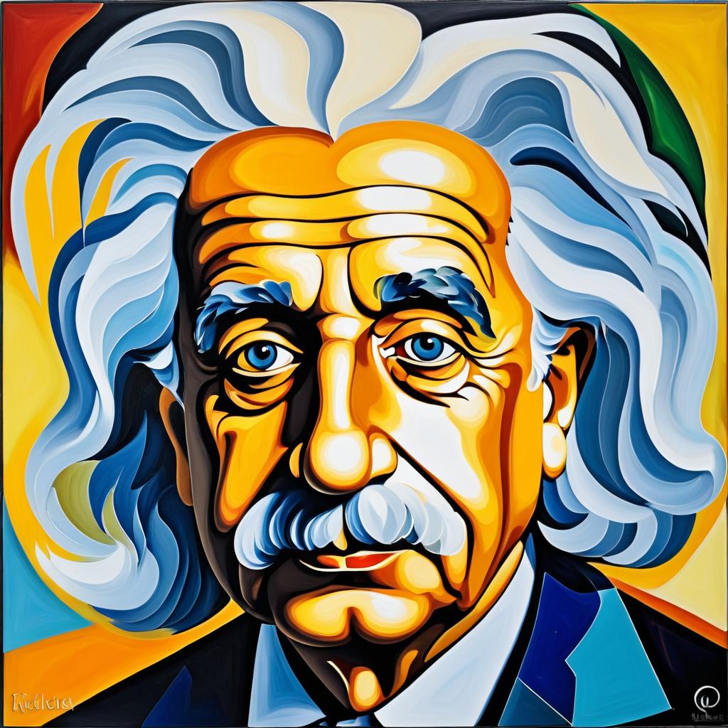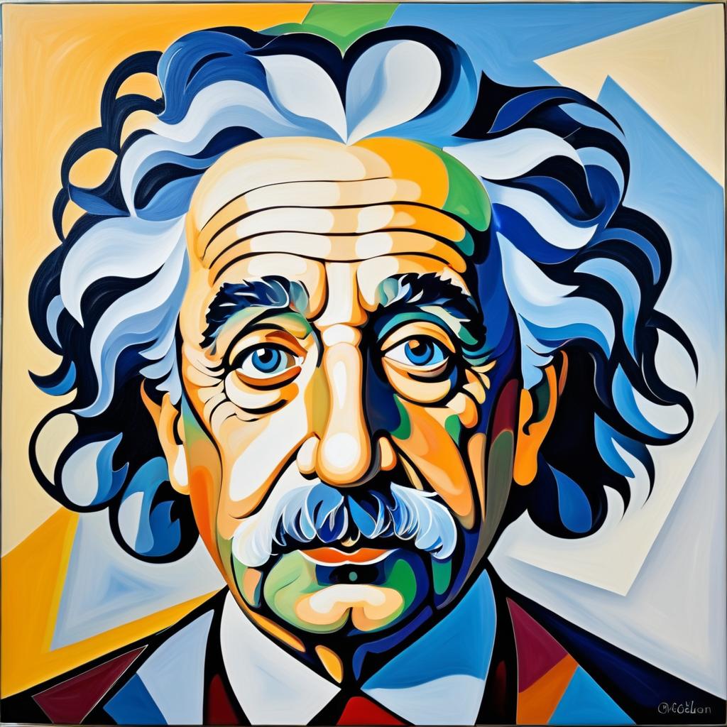 A portrait of Albert Einstein in the style of Pablo Picasso, painted in oil on canvas.