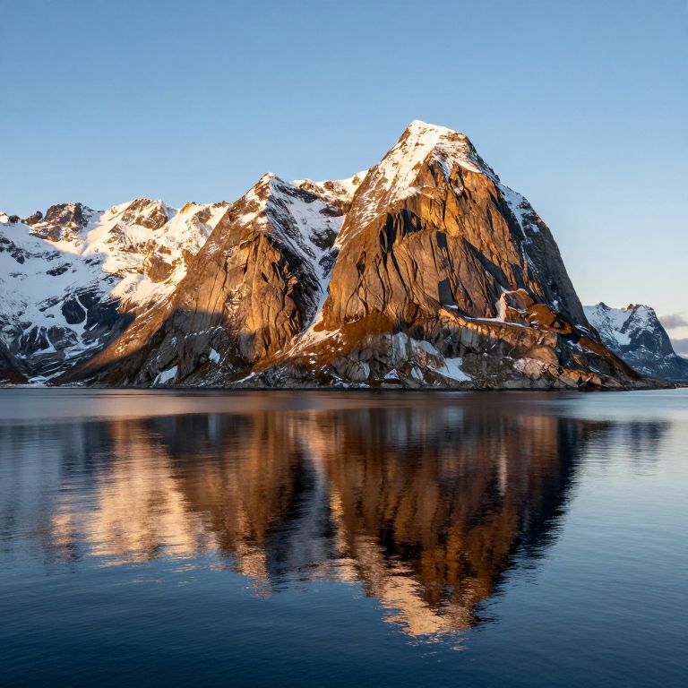 Mountainous islands rise majestically above the ocean, their snow-capped peaks bathed in golden sunlight, while their mirrored reflections extend deep into the tranquil waters below, creating a surreal, symmetrical landscape where nature defies gravity.