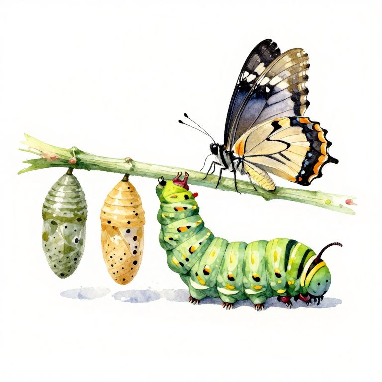 Mana watercolour painting of a swallowtail caterpillar showing the pupal stages from caterpillar to chrysalis to butterfly on a white background,