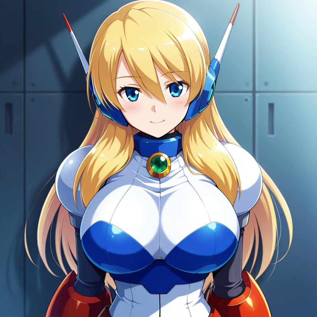 Alia (mega man), mega man (series), 1girl, robot ears, blue eyes, hair between eyes, blonde hair, long hair, large breasts, armor, armor, android, by artist colorful palette, illustrious