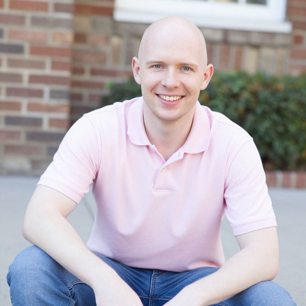 Photograph of a bald, smiling man with fair skin, wearing a light pink polo shirt and blue jeans, sitting outdoors against a brick wall.