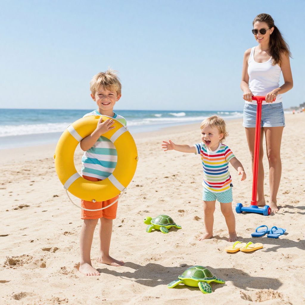 Family enjoying a sunny beach day with playful activities, including a smiling boy holding a yellow lifebuoy, a cheerful toddler reaching out, a woman holding a red and blue pogo stick, and scattered toys like a toy turtle and flip-flops on the sand.