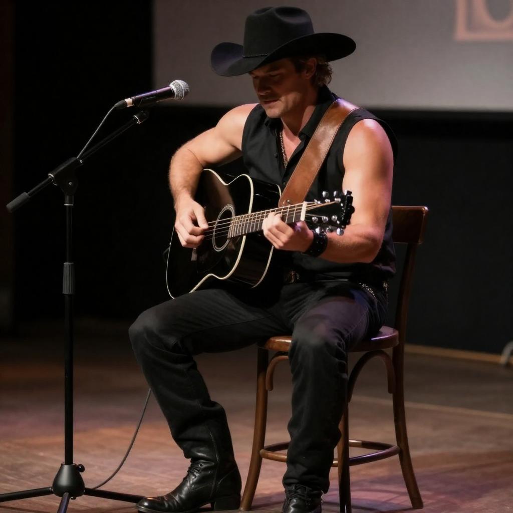Muscular shirtless man with tan skin and long brown hair wearing a black cowboy hat, black pants, and silver belt, raises his right arm while standing on a stage. Large audience in background, cheering. Dark, dimly lit venue with stage lights overhead.
