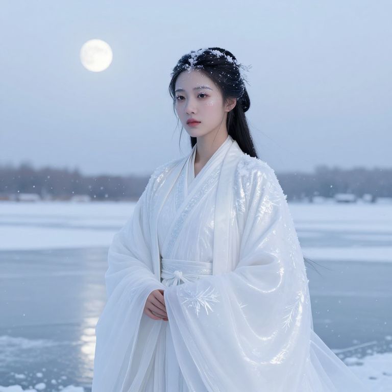 A serene winter snow spirit with flowing white robes that shimmer with icy frost patterns, standing on a frozen lake under a pale moonlit sky; her face is refined and peaceful with high cheekbones, soft lips, and a subtle frosty glow around her eyes, embodying cold beauty with a gentle, otherworldly presence as snow gently falls around her like a silken blanket.